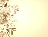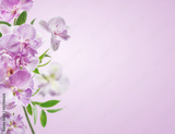 Pink orchids flowers border at pastel colored background. Front view with copy space.