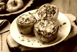 Stuffed peppers, halves of peppers stuffed with rice, dried tomatoes, herbs and cheese in a baking dish on a blue wooden table, top view. (Turkish name; biber dolmasi)