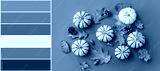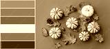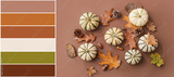 Beautiful autumn composition with pumpkins and fallen leaves on brown background. Different color patterns