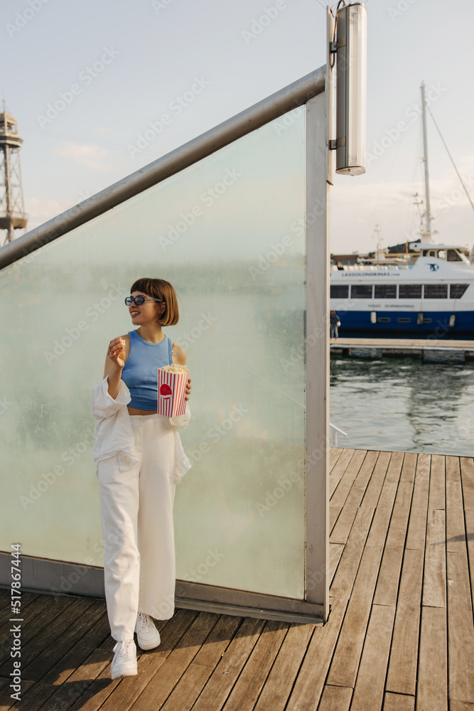 Pretty young caucasian girl holding pack of popcorn, look to side standing on pier by sea. Brown-haired woman with bob haircut wears casual clothes in summer. Lifestyle concept