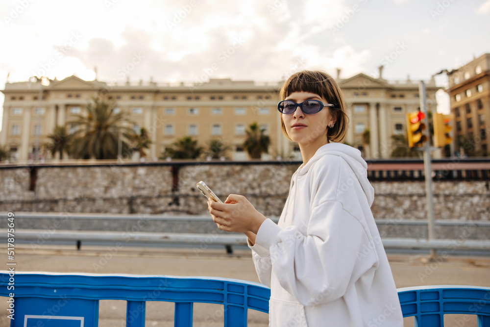 Cute young caucasian brown-haired lady looks at camera, holds smartphone standing on street. Girl with bob haircut wears white hoodie and sunglasses. Cell phone usage concept