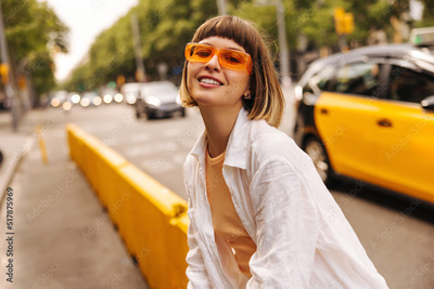 Smiling young caucasian woman looking at camera walking in public place. Brown-haired with bob haircut wears white shirt, orange glasses. Good mood concept
