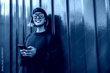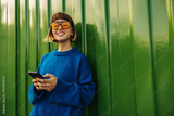 Happy young caucasian woman smiles with teeth looking at camera, holding phone standing against green wall. Brown-haired with bob haircut wears blue sweater in autumn weather. City life concept