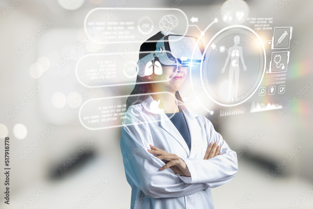 Telemedicine concept with doctor wearing VR glasses, staff or physician professional doctor use virtual reality headset to check and threat patient that stay