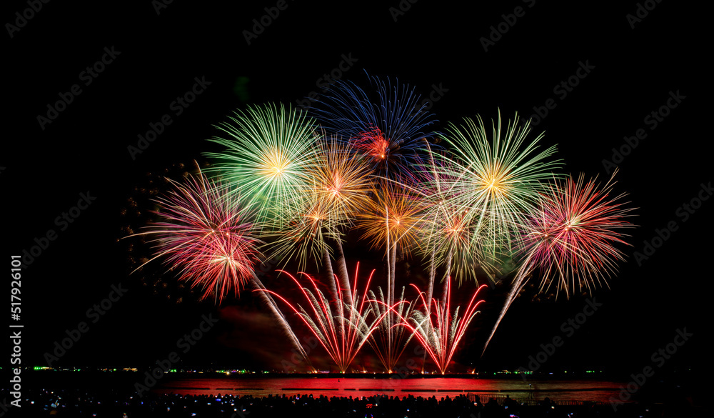 Colorful magical fireworks showing on sea in celebration festival with city lighting and black sky background.
