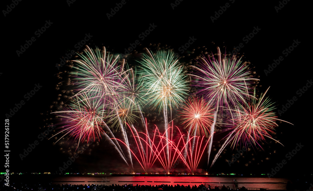 Colorful magical fireworks showing on sea in celebration festival with city lighting and black sky background.