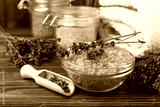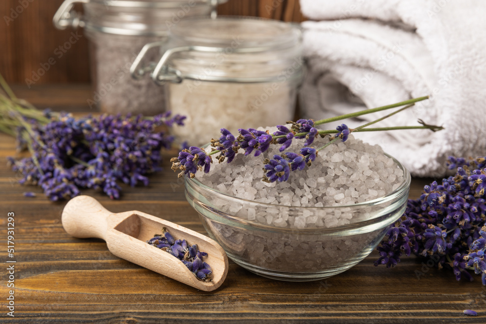 Lavender spa. Sea salt, lavender flowers and handmade soap. Natural herbal cosmetics with lavender flowers on brown texture wood.Spa and relaxation concept.Beauty treatments.Copy space.