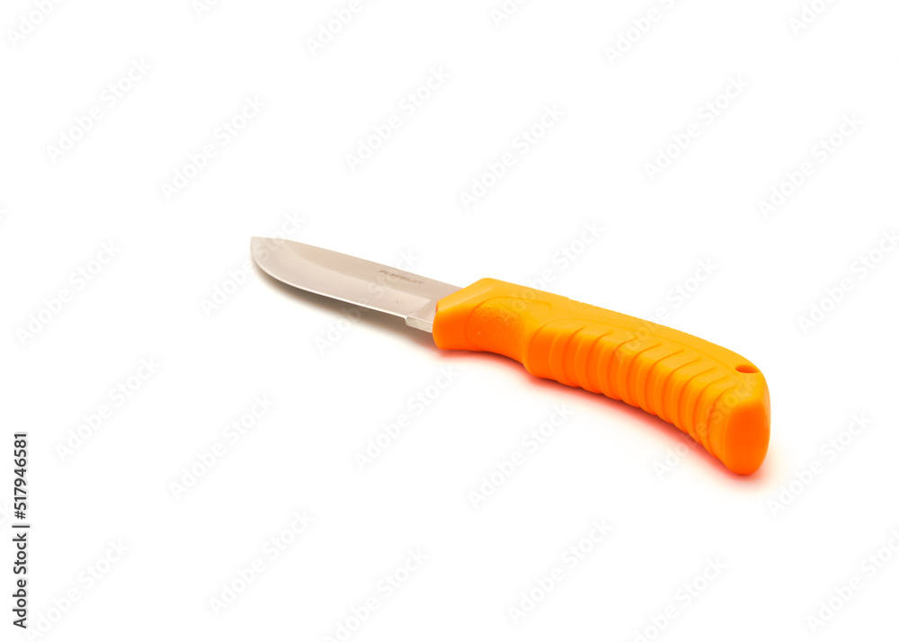 Deer hunting knife with thermoplastic rubber orange handle and razor sharp stainless steel blade isolated on white background