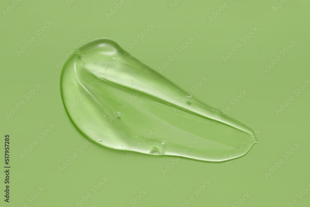 Cosmetic serum gel beauty swatch smear smudge on green color background. Skincare beauty product with bubbles texture.
