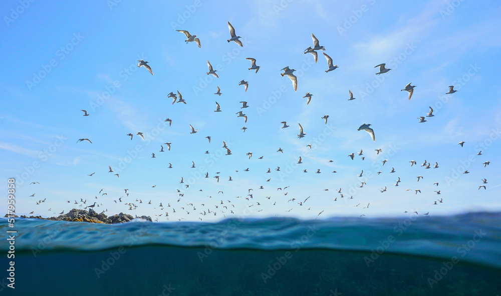 Colony of seabirds (Mediterranean gulls) flying in the sky seen from sea surface, Spain