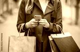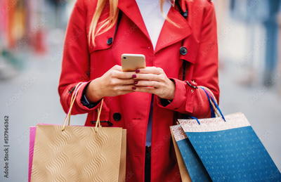 Woman using mobile phone during the shopping in the city, close up photo. Consumerism, lifestyle concept