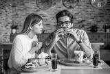 Young couple sitting in a cafe, having breakfast. Love, dating, food, lifestyle concept
