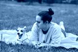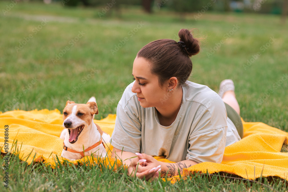 Woman in casual clothes lies with favorite fluffy trained purebred Jack Russel Terrier dog outdoors in the nature on orange blanket, summer day. Faithful best friends from childhood. Lifestyle concept