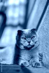 Beautiful Grey Scottish-fold shorthair fluffy cat with orange eyes chilling comfortably on the floor in sunny day. Warm picture toning. Pets care. World cat day. Image for websites about cats..