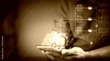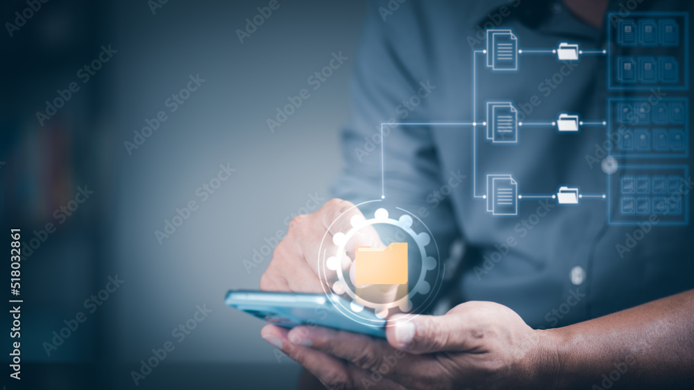 Businessman manages corporate information through smartphone screen. With digital cloud storage and secure connection with document privacy technology, cyberspace paperless document management system.