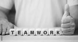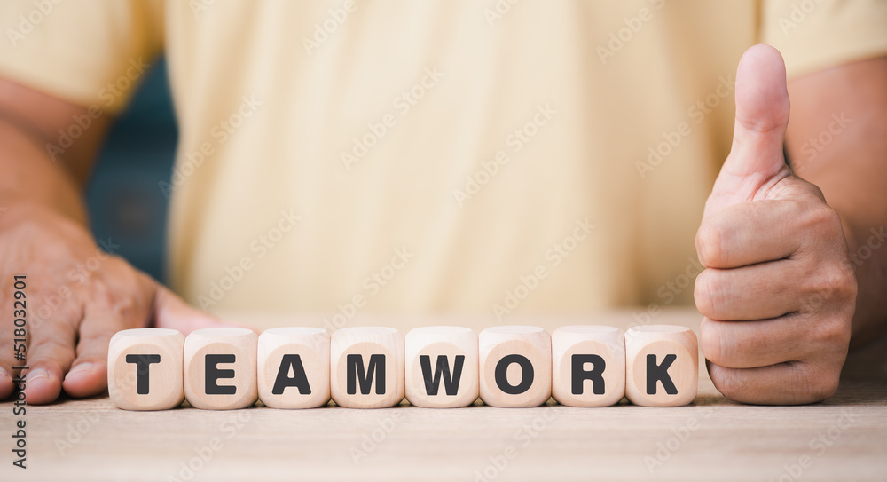 A young businessman with a wooden block line of leadership represents teamwork, business ideas and supportive friendships and cooperation of employees and friends. for the success of the organization