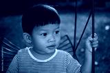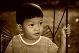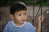 Little asian boy playing swing at playground.