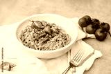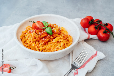 A plate of just cooked homemade fettuccine pasta with creamy tomato sauce, seafood and parmesan cheese, decorated with basil leaves on the grey stone background. Selective focus, copy space.