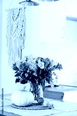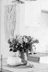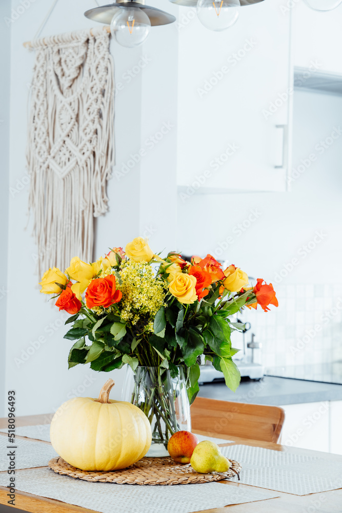 A vase of yellow and orange rose flowers, fresh pumpkin, apple and pear on a kitchen table counter with white modern kitchen background. Autumn home decor for Thanksgiving and Halloween holiday