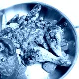oven roasted or baked baby chicken with vegetables in a metal pan