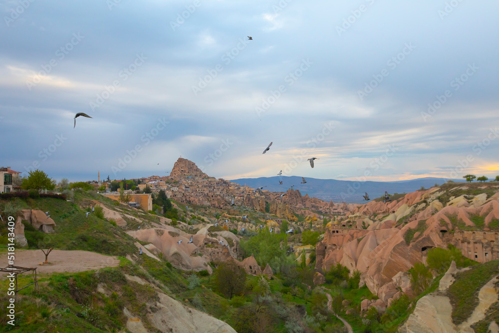A pigeon sits on a sign post above Pigeon Valley at Uchisar in the Cappadocia region of Turkey on a spring day.