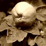 Detail of Cydonia oblonga tree also called Quince tree with unripe green fruits growing on branches