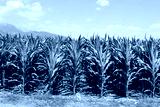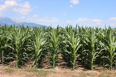 Green corn field on summer season against blue sky on a sunny day. Zea mays or corn cultivation