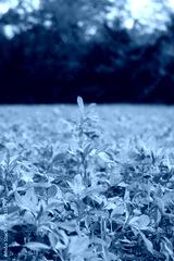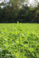 Alfalfa plants in the field on a sunny day. Medicago sativa cultivation on summer
