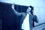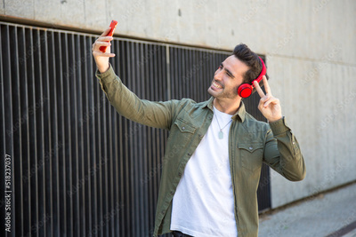 Man gesturing victory while taking a selfie with the mobile