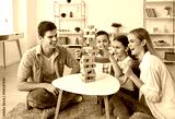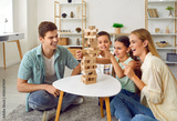 Happy family playing board games together. Parents and kids having fun at home. Cheerful, joyful mother, father and children sitting on floor and pulling wooden blocks from tower standing on low table