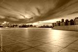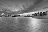 Empty floor and modern city skyline with building scenery at sunset in Suzhou, China.