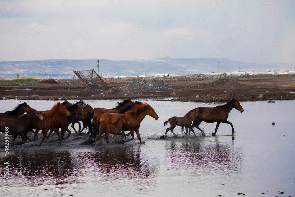 Yilki horses are running on the river. Yilki horses in Hormetci villiage in Kayseri Turkey .They are wild horses with no owners