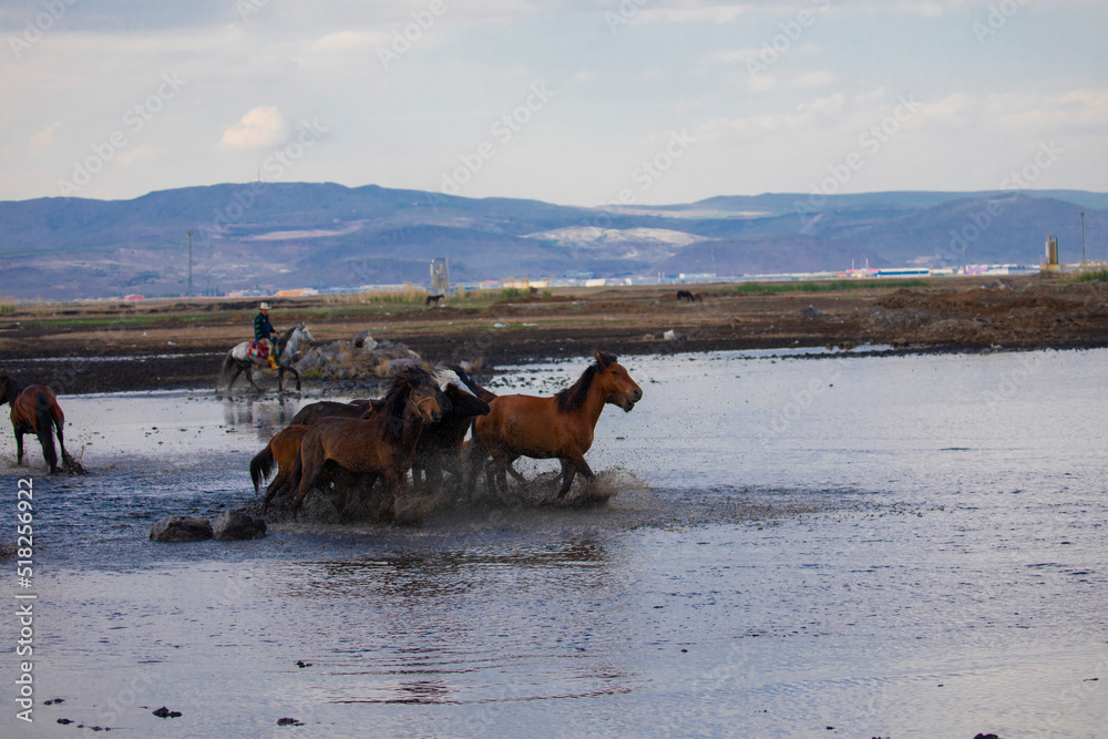 Yilki horses are running on the river. Yilki horses in Hormetci villiage in Kayseri Turkey .They are wild horses with no owners