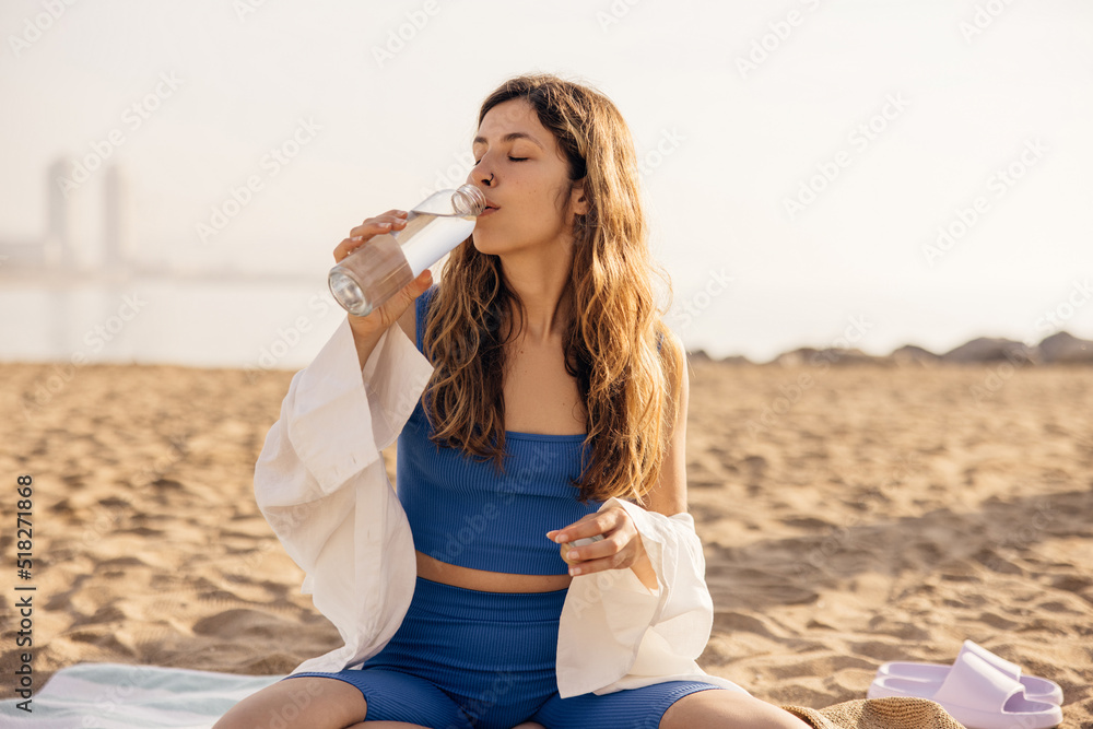 Nice young caucasian girl, closing eyes, quenches thirst by drinking water sitting on sand by sea. Blonde wears blue top, shorts and white shirt in summer. Weekend concept, leisure
