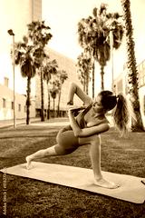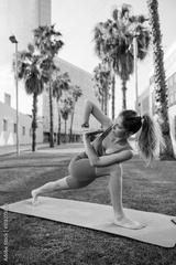 Sporty young caucasian girl in yoga pose on mat is engaged outdoor activities. Brown-haired woman wear leggings and top does exercises. Stress relief concept