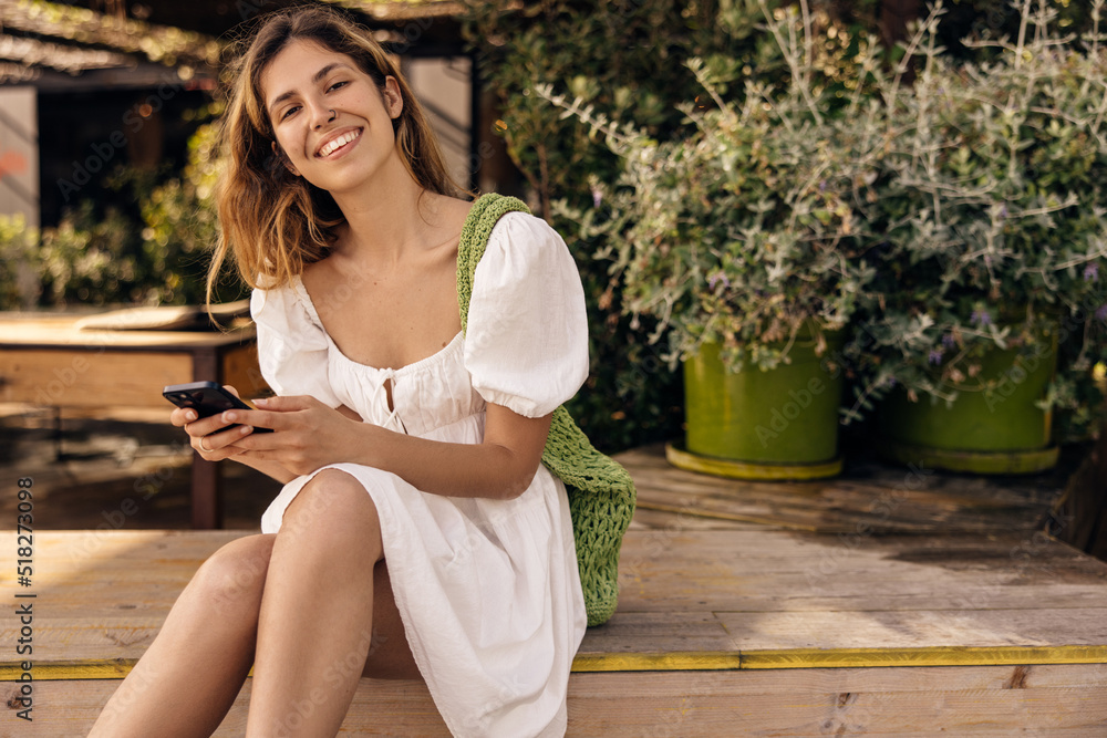 Joyful european young girl looking at camera using smartphone sitting outdoors. Blonde smiles, wears summer sundress and string bag. Lifestyle concept