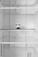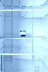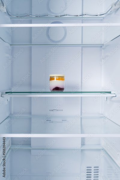 against the background of a white refrigerator, on a shelf, there is a glass jar with milk yogurt and jam