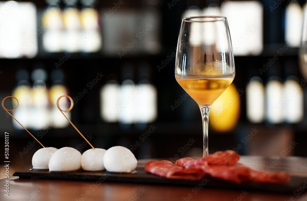 Glass of white wine and appetizer of mozzarella and ham.