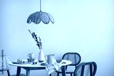 The stylish dining room with round table, rattan chair, lamp and kitchen accessories. Green leaf in vase. Beige wall. Home decor. Template.