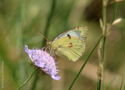 Papillon jaune sur fleur mauve, genre Colias, protection de la nature et biodiversité