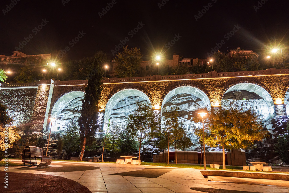Rike Central Park in Tbilisi. Stone arch bridge illuminated by spotlights
