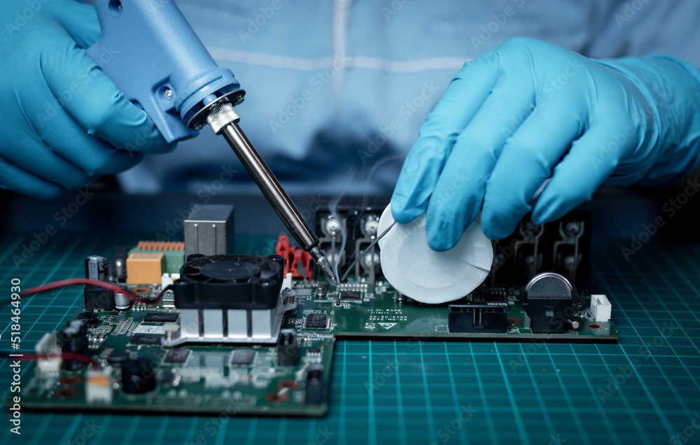 Technician under fixed digital video recorded CCTV board process by used tin soldering iron the chip is electronic component concept.