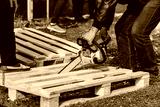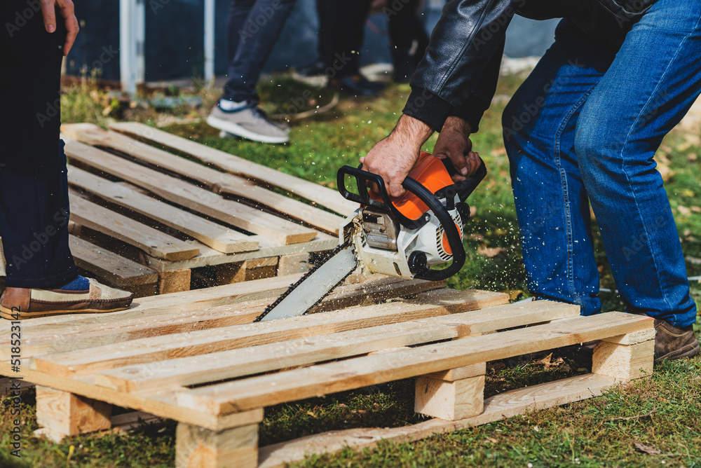 Man with chainsaw working with pallets.
