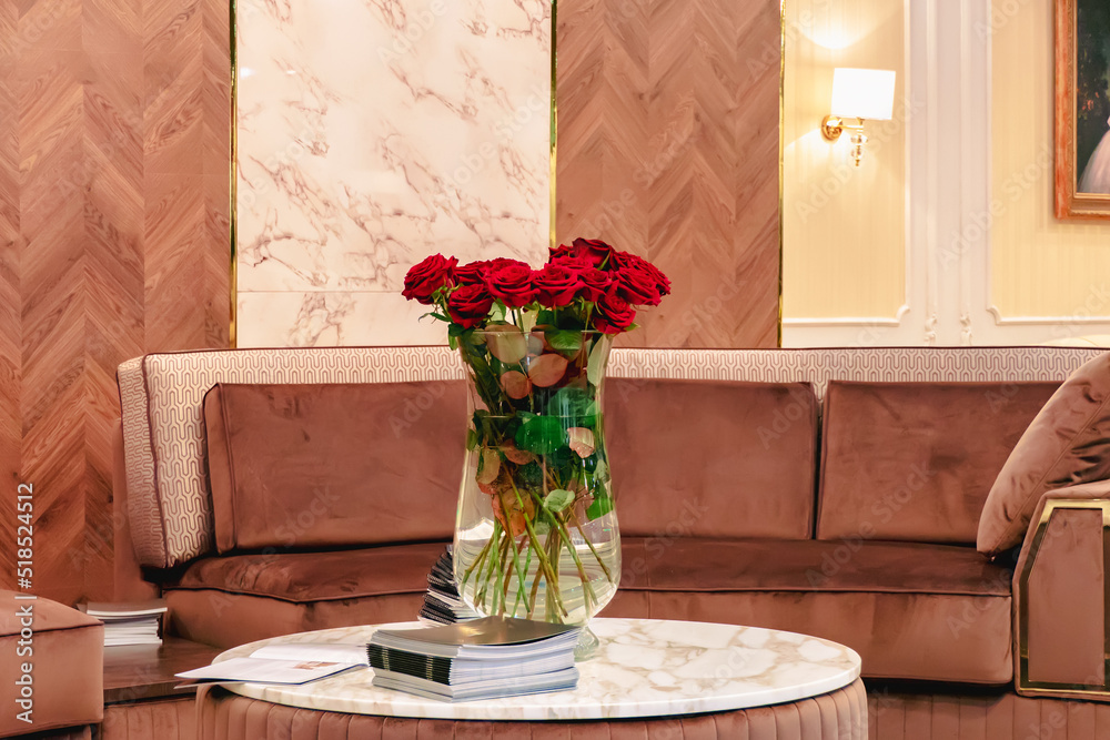 Bouquet of red roses in a glass vase on the table.