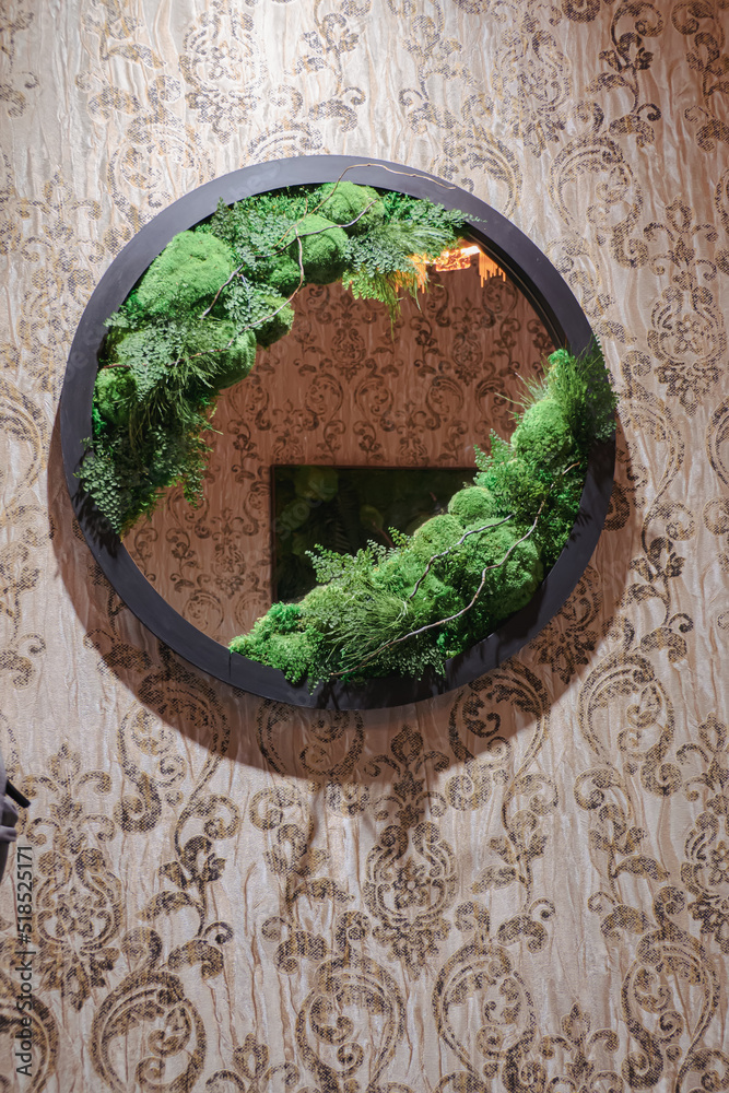 Round mirror in the bedroom. Mirror decorated with eco plants