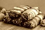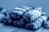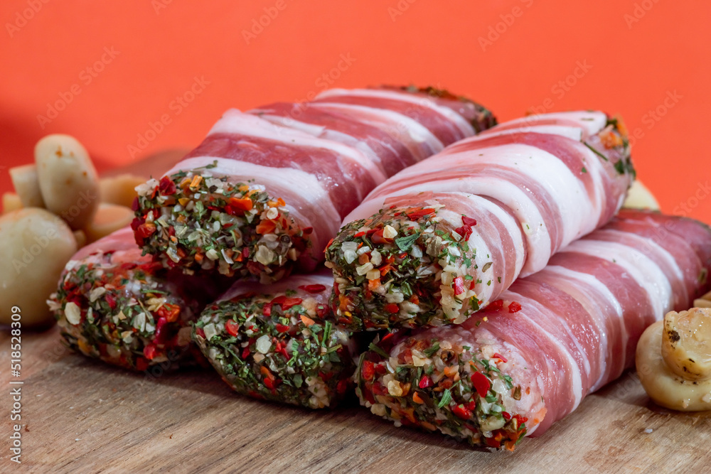 Bacon-wrapped meat roll with spices and herbs. Jamon pork, prosciutto, or presunto meat products, tartare meat inside. Meatloaf close up high focus view with shallow depth of field on a wooden board
