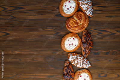 Homemade freshly baked bread. Wood rustic table, board. Bakery and baked goods bars, buns, rolls, biscuits and loaf bread, cookies, cakes, cheesecakes and pies, muffins. Top view, copy space