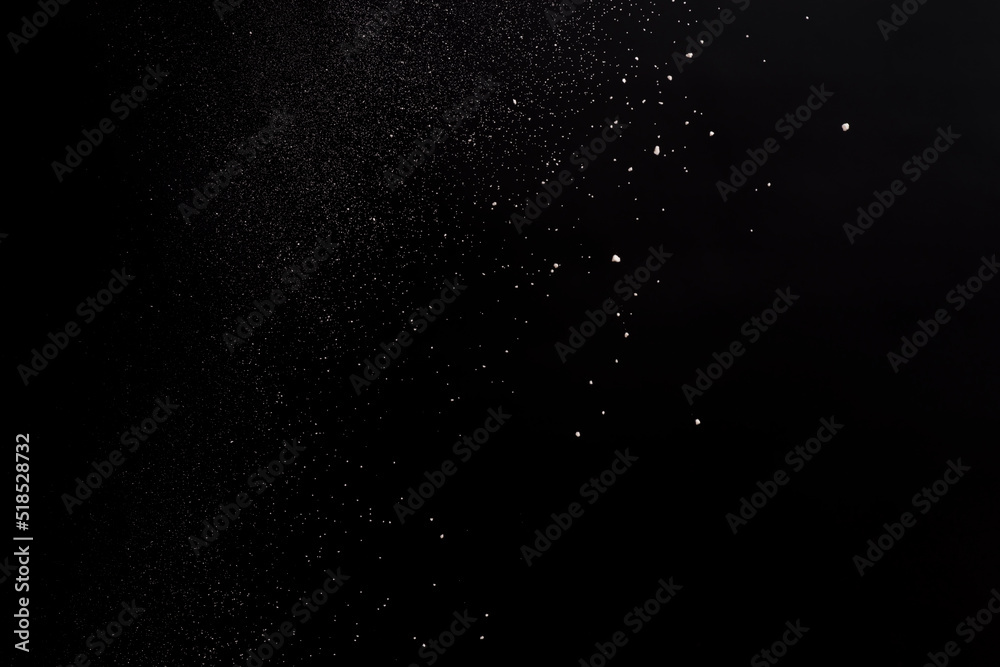 Flying white flour, powder on a black background. Spray of particles, lumps, pieces of white matter.Sweeping dry dust, paint, farina