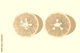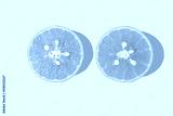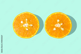 Two sliced oranges on pastel light blue background.Vitamin C concepe.