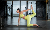 Young sporty attractive woman wearing sportswear practicing yoga working out on mat at gym background .Yoga is health care lifestyle.